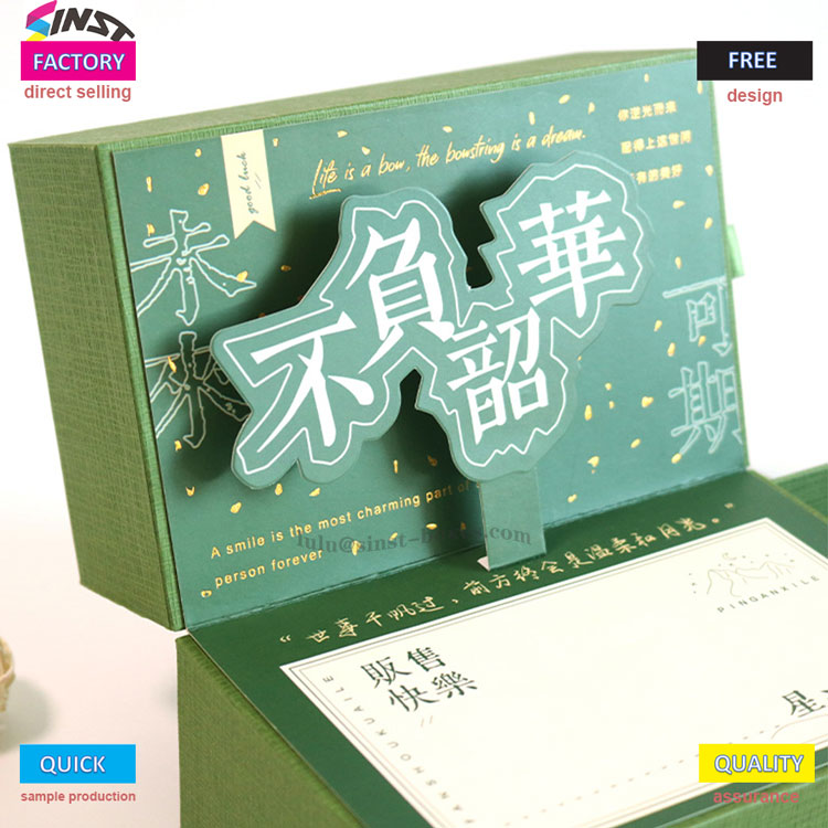 The body of this deluxe gift box is covered with green cloth texture material, which has a delicate touch; The box cover is centered around the hollowed out three-dimensional characters "Never Give Up to Youth", surrounded by small orange decorations. Above the words are printed in English such as "A smile is the most charming", conveying a warm atmosphere and conveying the feelings carried by the gift box.