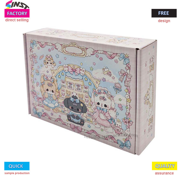 This is a Colorful corrugated paper airplane box for clothes that features a sweet and cute style. The material is corrugated cardboard and the overall color scheme is predominantly pink, making it suitable for pairing with various soft and cute clothing styles. After opening, you can even discover the ingenuity - the substrate inside the box is also filled with cartoon patterns, with little dogs, cats sitting or lying, surrounded by soft elements such as clouds and hearts. The pattern style inside and outside is unified, simple yet pleasing enough.