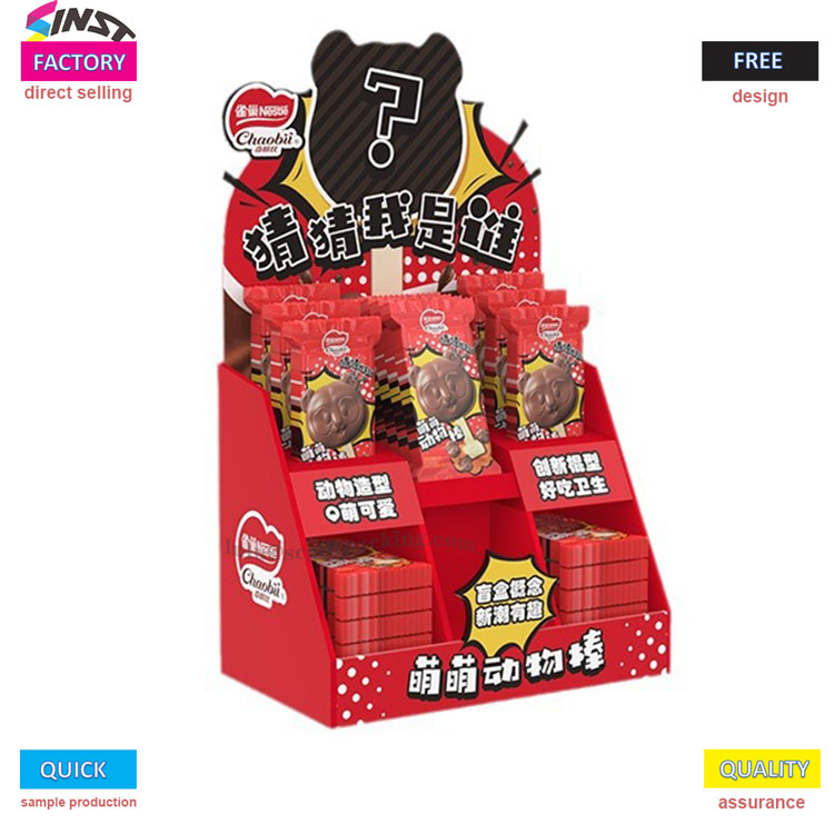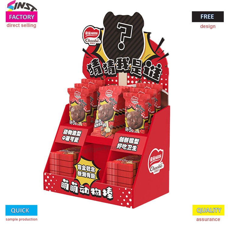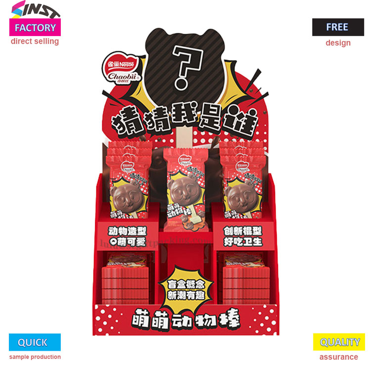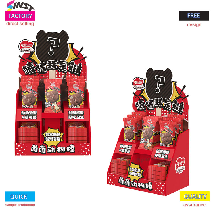This Pet Snack Cardboard PDQ Display Box features high saturation red as its main color and comes with visual impact, making it an eye-catching tool for terminal displays. The fun slogan "Guess Who I Am" on the top of the box stimulates consumers' curiosity; The interior adopts a multi-layer layered structure, neatly displaying animal shaped snack packaging (in the form of lollipops).
