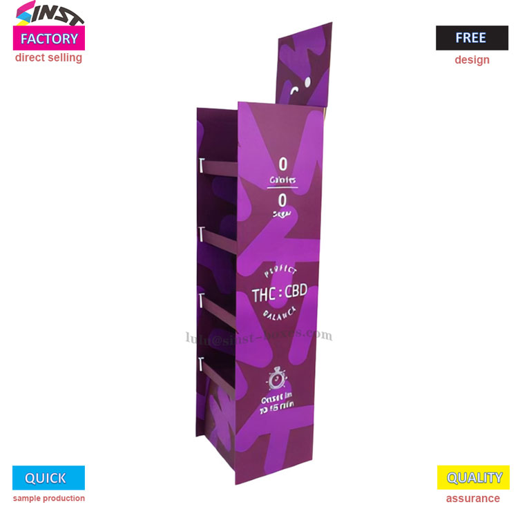 What's good about it? Firstly, the color is bright purple with some playful patterns, which can be placed next to the cashier or shelf and immediately catch people's attention; In addition, it is divided into several layers, which can display many small items and not take up space, allowing more people to see these small items in the store; Moreover, this shelf is made of cardboard, which saves costs and allows small shops to purchase without worrying about money; Finally, this is made by an old factory that has been producing exhibition stands for 15 years. You can customize any style you want, and you can quickly get it ready for urgent orders or sample production. You don't need tools to assemble it, which is particularly convenient.