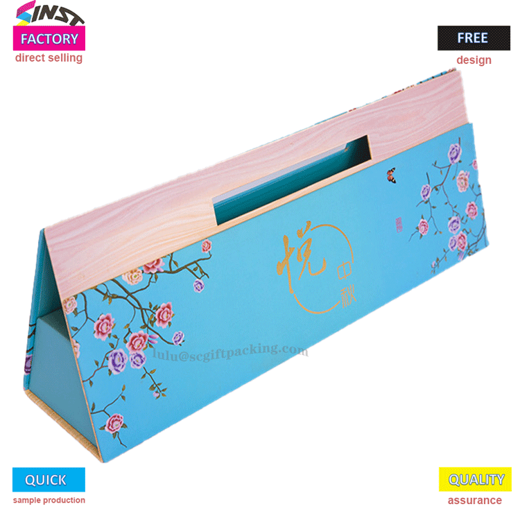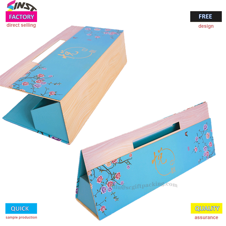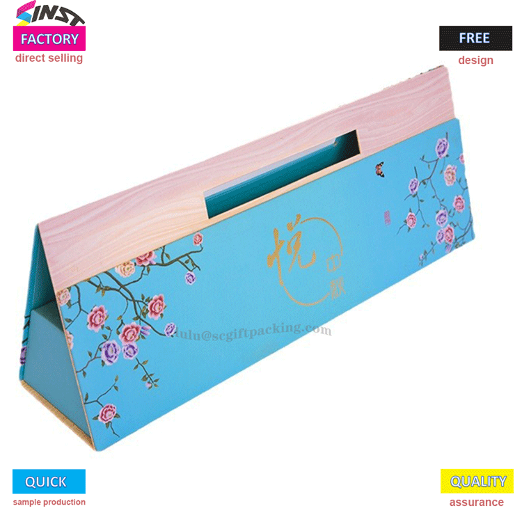 Triangle Folding Paper Shaped Handheld Food Gift Box stands out with its innovative design and high-quality materials. The shape of the triangle is particularly innovative, which can instantly attract attention and add a special sense of surprise to the gift. This box has excellent folding performance, is easy to open and close, and is easy to place and retrieve items. Whether used for packaging delicate small items, jewelry, creative gifts, etc., they can be perfectly matched to highlight the unique value of the gift. It is not only a gift box, but also an artistic decoration that provides new choices for your gift packaging, allowing recipients to feel your care and unique taste.