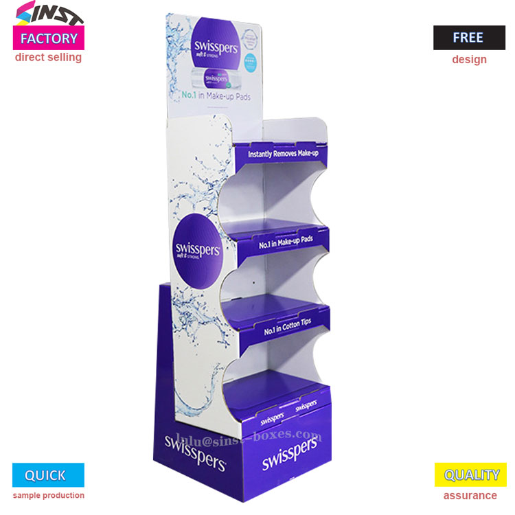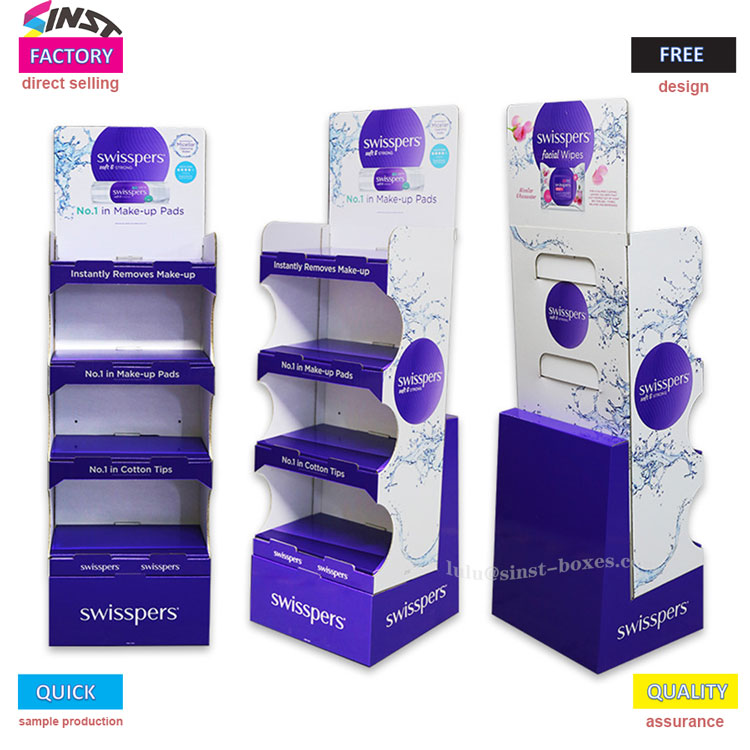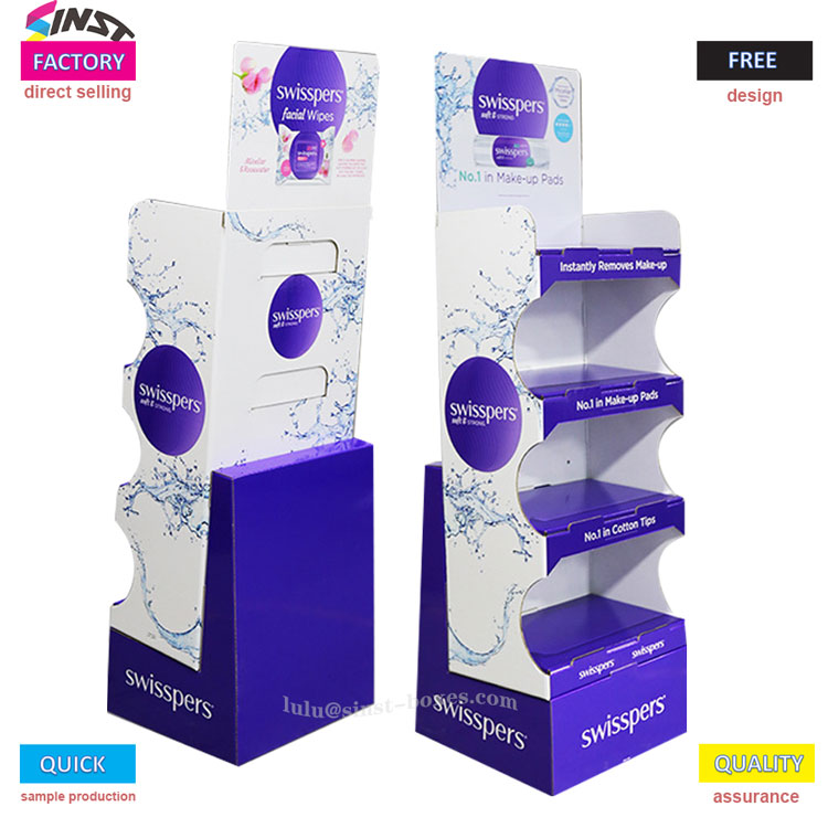The Wet wipe display rack is designed with multiple layers, each with grooves to securely hold small items such as wet wipes and cotton swabs, making it easy to access. The material is cardboard, which is lightweight and easy to arrange, and it is also convenient to restock. It belongs to the type of display tool that looks simple and stands firm when used.